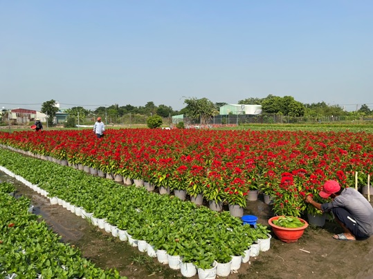 Tại các hộ trồng hoa nền trên địa bàn Quận 12, nhìn chung do tình hình dịch COVID-19 vẫn còn phức tạp, nhiều nhà vườn tâm lý lo ngại đầu ra cho vụ hoa Tết, nên số lượng hoa ở các nhà vườn giảm đi một nửa. Bên cạnh đó các chi phí như nhân công, vật tư, hạt giống, phân bón, … đều tăng giá nên dẫn đến tình trạng giá thành sản xuất tăng khoảng 10 – 20%. Hoa nền với nhiều chủng loại đa dạng như: Mào gà, Các tường, Cẩm chướng, Cúc Mai, Cúc Ruby và một số chủng loại mới…
