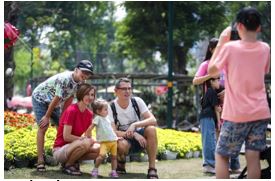 Du khách quốc tế cùng gia đình lưu lại khoảnh khắc đầu năm tại hội hoa xuân, một trong những điểm đến thu hút khách trong dịp Tết Nguyên đán ở TP.HCM