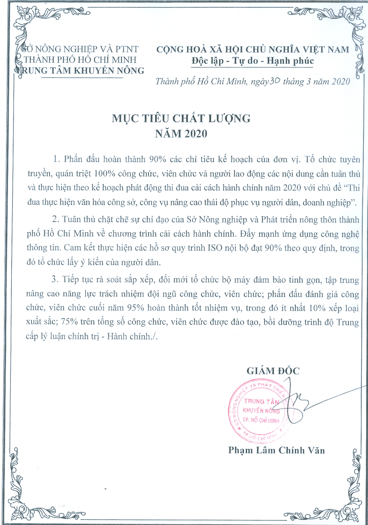 Nhằm áp dụng có hiệu quả Hệ thống quản lý chất lượng (HTQLCL) theo tiêu chuẩn quốc gia TCVN ISO 9001:2015 vào hoạt động của Trung tâm Khuyến nông giúp viên chức, người lao động thực hiện công việc khoa...