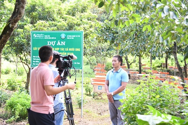 Các phóng viên phỏng vấn chủ mô hình Hợp tác xã nuôi ong và xây dựng sản phẩm OCOP tại xã Sơn Lộc, huyện Can Lộc, tỉnh Hà Tĩnh